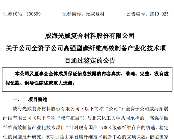 4月2日,光威復材(300699.sz)發(fā)布公告,公告顯示,公司全資子公司高強型碳纖維高效制備產(chǎn)業(yè)化技術(shù)項目通過鑒定。